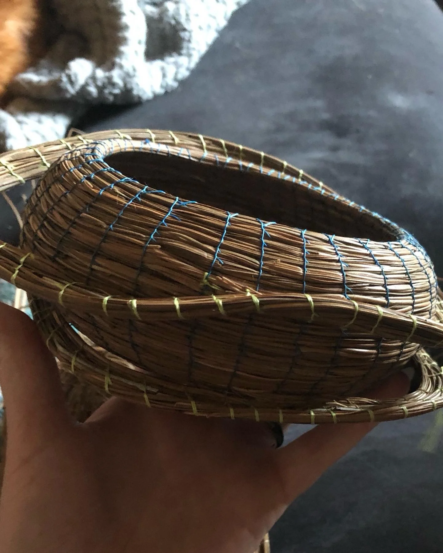 This started as a way to explore a couple new natural fiber threads. I also used a smaller diameter of coils to achieve a thinner feel in the ribboning technique. I learned with this piece that embroidery floss does not work very well as a thread. Pulling it multiple times through the pine needles created a mess as each strand decided to catch at different spots. There was breakage and frustration. But the result was a colorful multi textured sculpture.